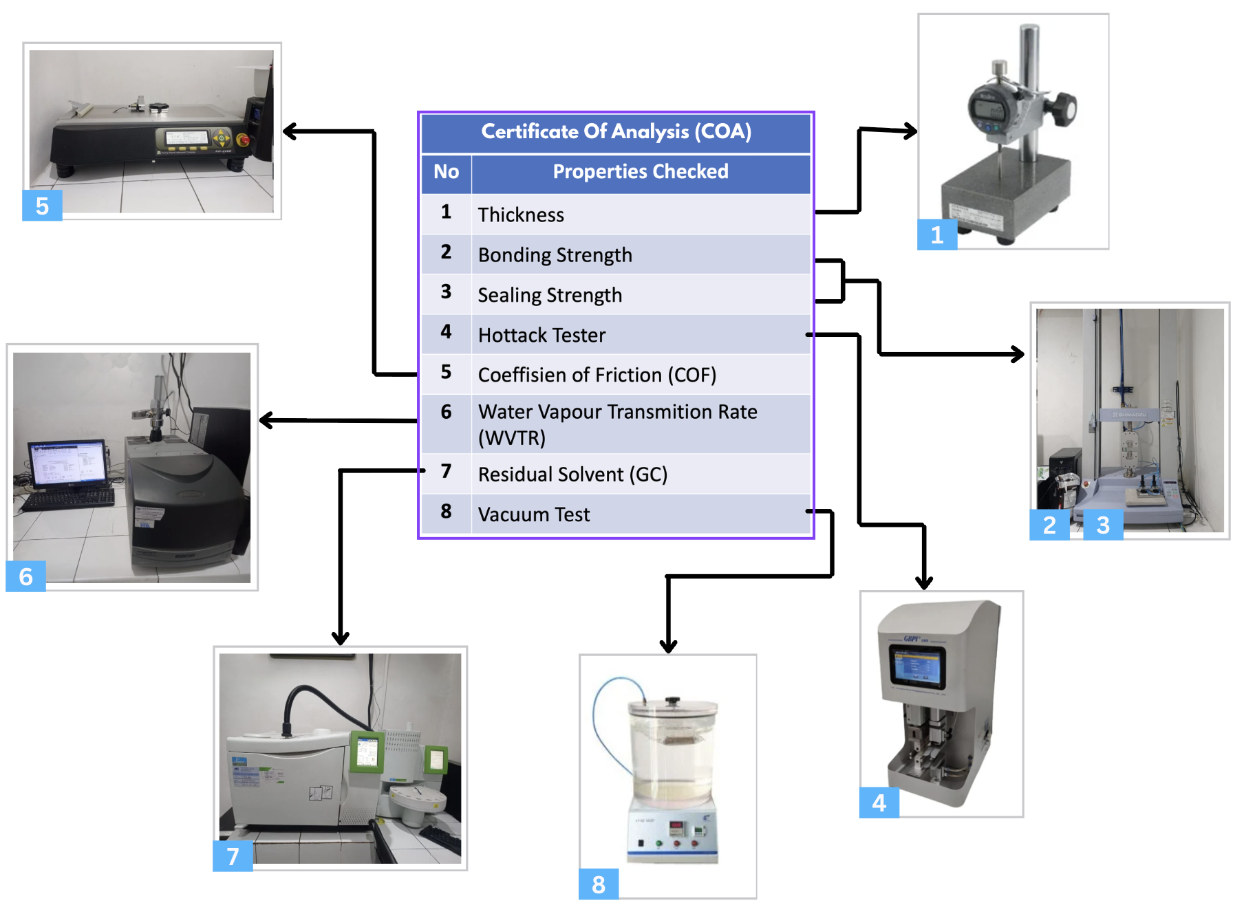 Our Quality Assurance laboratories are equipped with modern testing and analytical equipment to evaluate critical performance characteristics of flexible packaging materials. These tests ensure product reliability, safety, and consistency prior to delivery.